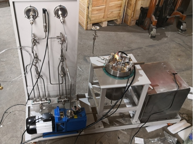 釜底:气相接口f通过三通过滤器引至操作屏:进气阀、排气阀及抽真空阀,真空表泄压阀等;三通连接压力传感器(可选项0~40Mpa)与轴向压力表?100,0~40Mpa;轴向真空表:?100,-0.1~-0.9Mpa。配N2气瓶进气管、爆破阀泄压管、排空管、釜盖三支脚支架1件,手动扭力扳手筒一付。釜内料舟尺寸发需方确认(3升釜内料舟粉体容量约180毫升,出厂装1个料舟备2个料舟)。