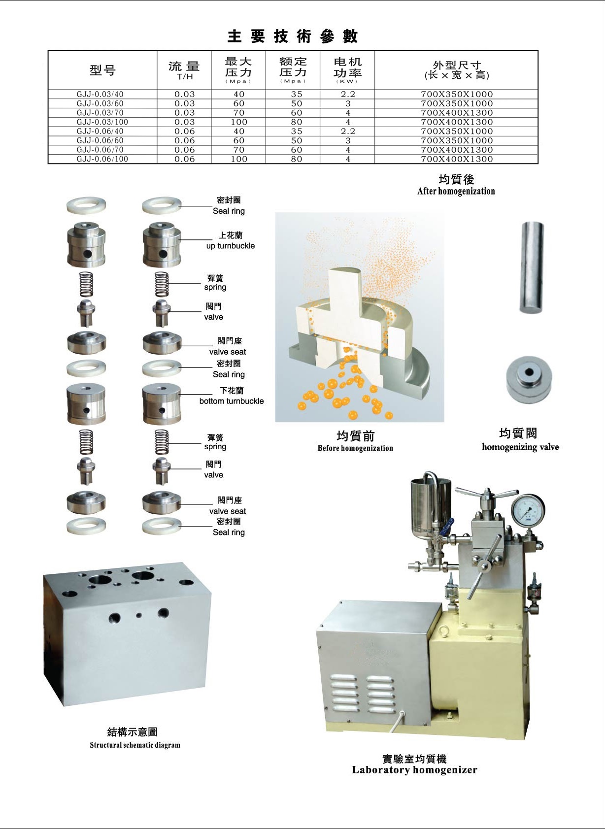 GJJ-0.03/100实验室均质机 ,一个小时处理量30L,大压力100mpa,工作压力0-80mpa,小试验量150ml,功率:4kw,电压:三相380Vv50hz,双柱塞结构 ,柱塞根数:2根,柱塞密封圈:盘根,单向阀材质:司太立合金,调压阀材质:硬质合金,调压阀:两极,压力表:卫生级隔膜表