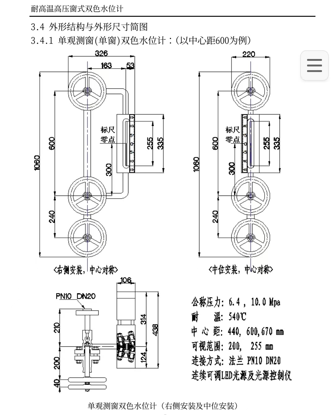 公称压力:6.4 ,10.0 Mpa 耐温:540℃ 距:440,600,670mm 可视范围:200,255mm 连接方式:法兰PN10 DN20 连续可调LED光源及光源控制仪