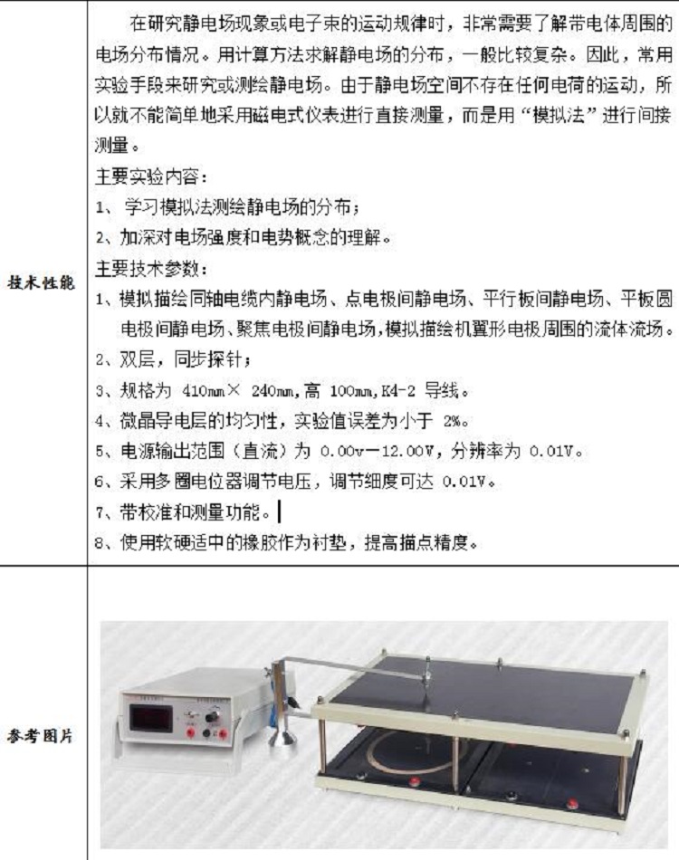 1、模拟描绘同轴电缆内静电场、点电极间静电场、平行板间静电场、平板圆电极间静电场、聚焦电极间静电场,模拟描绘机翼形电极周围的流体流场。