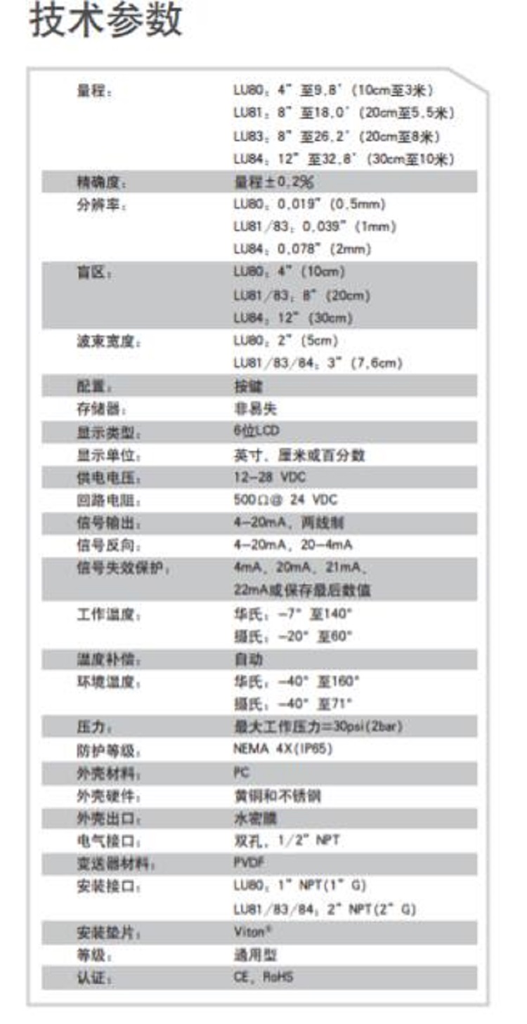 死区:LU80:10cm,LU81/LU83:20cm,LU84:30cm