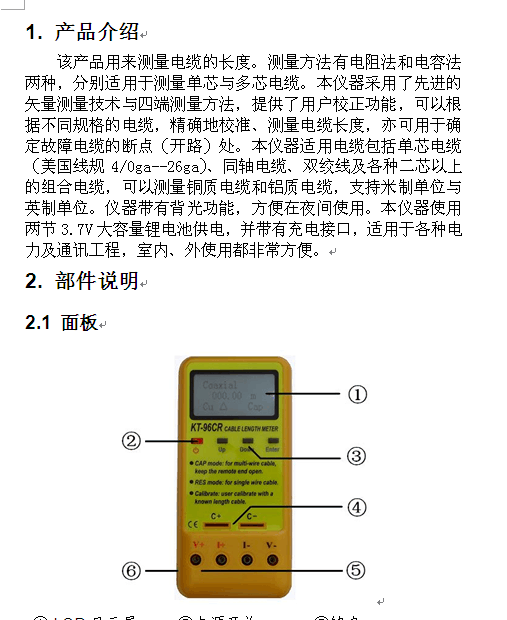 该产品用来测量电缆的长度。测量方法有电阻法和电容法两种,分别适用于测量单芯与多芯电缆。本仪器采用了矢量测量技术与四端测量方法,提供了用户校正功能,可以根据不同规格的电缆,地校准、测量电缆长度,亦可用于确定故障电缆的断点(开路)处。本仪器适用电缆包括单芯电缆(美国线规4/0ga--26ga)、同轴电缆、双绞线及各种二芯以上的组合电缆,可以测量铜质电缆和铝质电缆,支持米制单位与英制单位。仪器带有背光功能,方便在夜间使用。本仪器使用两节3.7V大容量锂电池供电,并带有充电接口,适用于各种电力及通讯工程,室内、外使用都非常方便。