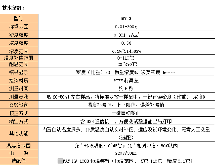 2.内置自动温度(选配),溶液温度自动实时补偿,也可选配恒温设备MAM-HW-1008,测量在特定温度(如25℃)的密度/浓度/波美度值;