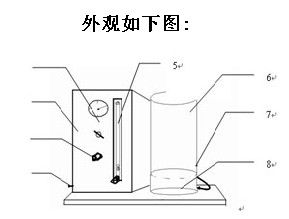 三.操作步骤和方法:A).接通压缩空气接口1.B)将流化杯底侧的流出小口用胶带纸封好.C)称取待测粉末样品250克,置于流化杯6中.D)打开旋纽2,至压力表4的刻度指示在1-3kgf.E)调节流量计按钮至200 l/h,使粉末流化20-30秒,采用带刻度的塑料直尺测试粉末的大高度,可以在三个测试点测量,取平均值,记为h1,以厘米(cm)表示,到毫米(mm).F)关闭流量计按钮,使流化杯中的粉末静置10秒钟,方法同前测试粉末的大高度,可测试三个点取平均值,记为h0,以厘米(cm)表示,至毫米(mm).G)重新开启流量计至压缩空气流量在200l/h,使粉末充分流化,打开流化桶底侧的封条,称量并记录30秒内流出的粉末质量,记为m,至克(g).H)清理仪器,并计算粉末的流化指数。