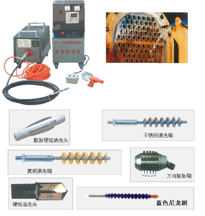 工作原理:YT-1800A型清洗机的清洗工具,是直接装在软轴,机器将水送进软轴封直达清洗工具。清洗刷,是尼龙和猪棕两种材料制作。刷子的直径大一被清洗管道2mm为宜,刷子的可安装硬垢清洗头,用来疏通已堵的管子,疏通效果保您满意,决不会划伤管壁。