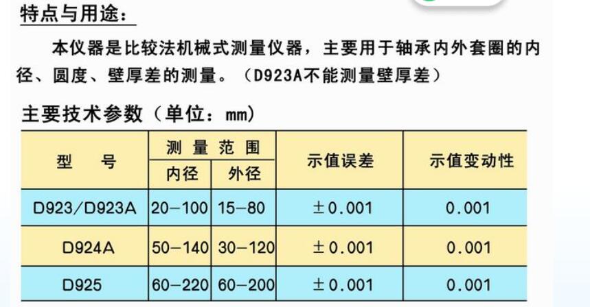 本仪器是比较法机械式测量仪器,主要用于轴承内外圈的内径、圆度、壁厚差的测量。(D923A不 能测量壁厚差)